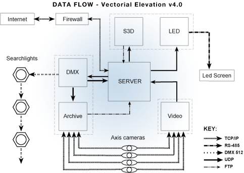 When a request reaches the head of the queue, the data is sent to a 3D DMX application. This application knows the exact 3D position of each searchlight thanks to a calibration performed with GPS surveying. The DMX application sends appropriate DMX commands over a wireless signal to the 20 Syncrolite SX10K searchlights to direct them to the desired location. The SX10Ks are new-generation 10kW xenon robotic fixtures that produce a very collimated lightbeam.
